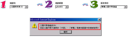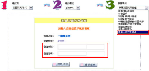 選擇服務項目-「專屬三國代幣儲值」,輸入三國代幣儲值的序號和密碼。