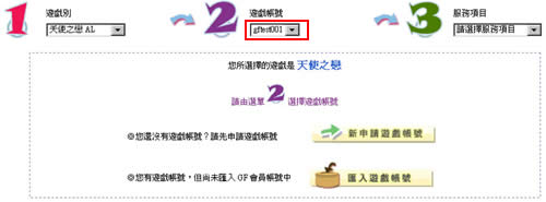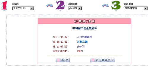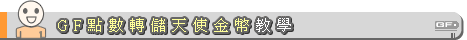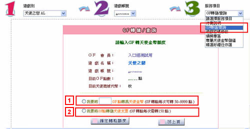 ★Step5-1.選擇「GF轉儲/查詢」。 如要將GF點轉儲為天使金幣,即於1輸入想轉儲的天使金幣。 如要將GF點轉儲為天使支票,即於2輸入想轉儲的天使支票。