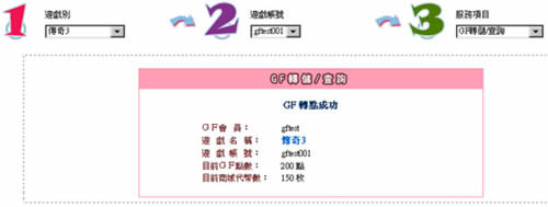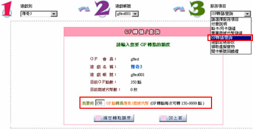 ★Step5-1.選擇「GF轉儲/查詢」並填入想轉換商城代幣的數值。(GF轉點每次最少150點)