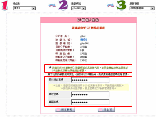 ★Step5-2.請確認欲轉點的點數數目,若資料無誤請點「我確定將GF點數轉入遊戲帳號成為商城代幣.....」,並需更改遊戲密碼後,再按下確定轉點。