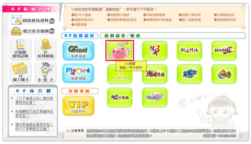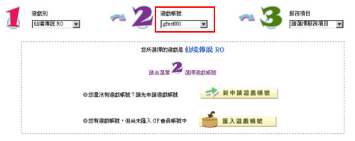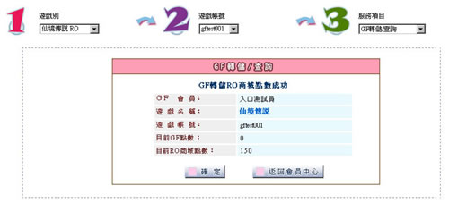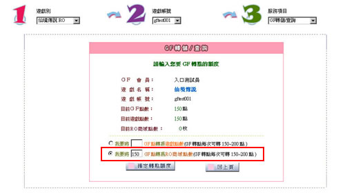 ★Step5-1. 選擇「GF轉儲/查詢」,點選''我要將GF點轉為RO商城點數'',並填入想轉換商城點數的數值。(GF轉點每次最少150點)