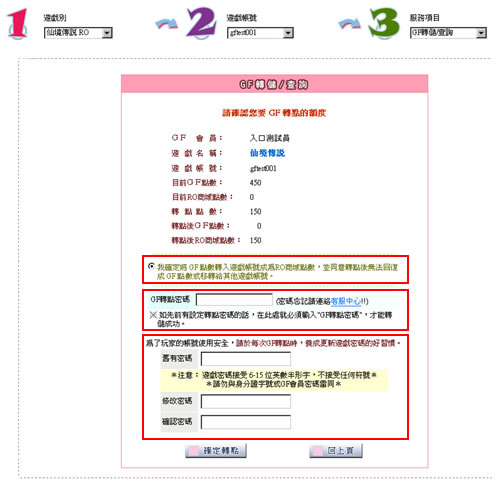 ★Step5-2.請確認欲轉點的點數數目,若資料無誤請點「我確定將GF點數轉入遊戲帳號成為RO商城點數.....」,並需更改遊戲密碼後,再按下確定轉點。 【注意】為了保障GF轉點的安全,當你先前已有設定”GF轉點密碼”,在轉儲點數時就須輸入”GF轉點密碼”,才能轉儲成功;若未設定則不用輸入此密碼。