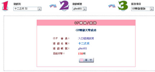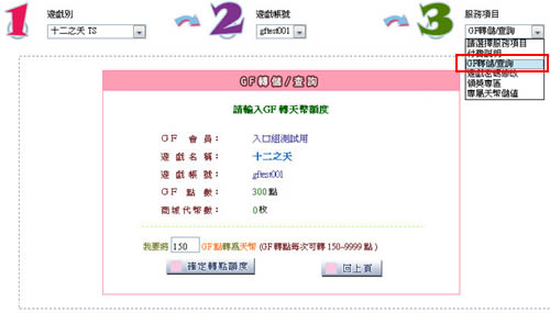 ★Step5-1.選擇「GF轉儲/查詢」並填入想轉儲天幣的數值。(GF轉點每次最少150點)