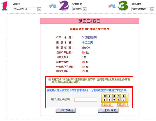 為了保障GF轉點的安全,請先設定「滑鼠密碼鎖」,在轉儲各遊戲專用點數時必須輸入「滑鼠密碼鎖」,才能轉儲成功;若未設定則無法完成轉點步驟。