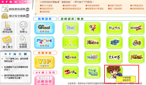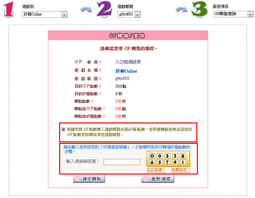 為了保障GF轉點的安全,請先設定「滑鼠密碼鎖」,在轉儲各遊戲專用點數時必須輸入「滑鼠密碼鎖」,才能轉儲成功;若未設定則無法完成轉點步驟。