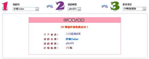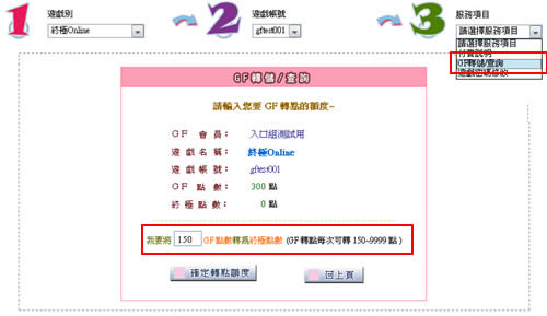 ★Step5-1.選擇「GF轉儲/查詢」並填入想轉儲終極點數的數值。(GF轉點每次最少150點)