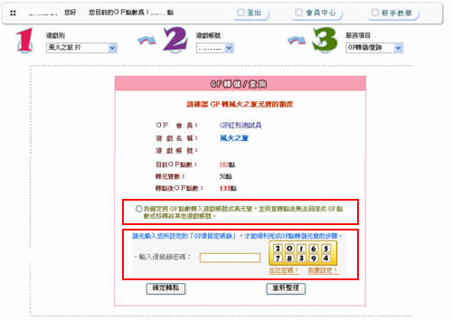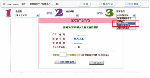 ★Step5-1.選擇「GF轉儲/查詢」並填入欲轉儲元寶的額度。